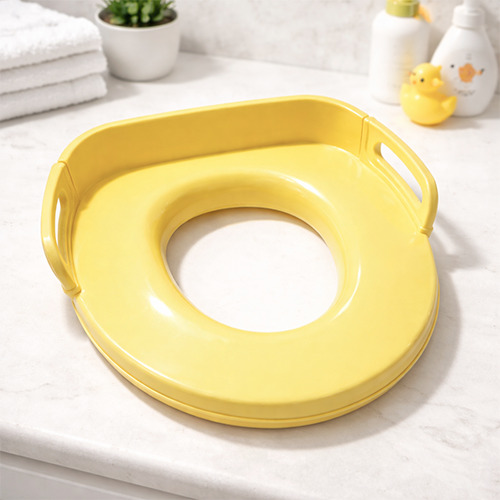 Reductor de inodoro con agarre, respaldo y guías ajustables.
