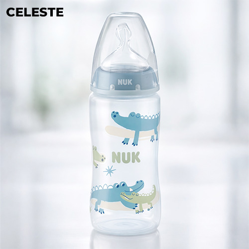Mamadera línea First Choice+, ahora con indicador de temperatura en la escala de medición. El color cambia con la temperatura del contenido. Si el alimento está demasiado caliente, el indicador pasa de color azul a blanco. Tetina de silicona con formato Ortodóntico NUK mejorado, que se adapta perfectamente a la mandíbula del bebé. Con sistema de ventilación NUK ANTI-COLIC AIR SYSTEM, que ayuda a prevenir los cólicos. Cuello ancho que facilita el llenado y la limpieza. Probado clínicamente*: para una combinación óptima de amamantamiento y mamadera. 300ml, con tetina de 6-18 meses, flujo M.