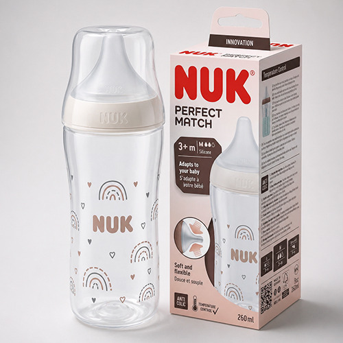 Mamadera Perfect Match, con tetina de silicona suave, 260 ml, desde 0 meses, Sin BPA, Anti cólico, con Control de Temperatura. Se adapta a tu bebé: tetina especialmente flexible y suave. Forma suavemente ahusada con función anti cólicos: para un flujo de bebida tranquilo y relajado, talla S con un contenido de 260 ml (a partir de 0 meses, para leche materna, té y agua). Reposa labios grande y ancho: su bebé se siente como piel cuando bebe. Con indicador de control de temperatura patentado, sin BPA. Se puede combinar con todos los accesorios de los sacaleches NUK Perfect Match y NUK Soft&Easy.