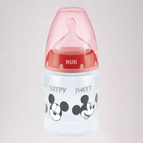 Mamadera Nuk Disney Mickey Mouse 150 ml Sistema anti cólicos con control de temperatura. Con Indicador de Temperatura en la escala de medición. El color cambia con la temperatura del contenido. Si el alimento está demasiado caliente, el indicador pasa de color azul a blanco. Tetina de silicona con formato Ortodóntico mejorado, que se adapta perfectamente a la mandíbula del bebé. Con sistema de ventilación NUK ANTI-COLIC AIR SYSTEM, que ayuda a prevenir los cólicos. Cuello ancho que facilita el llenado y la limpieza. Probado clínicamente: para una combinación óptima de amamantamiento y mamadera. 150ml, con tetina de 0-6 meses, flujo M.