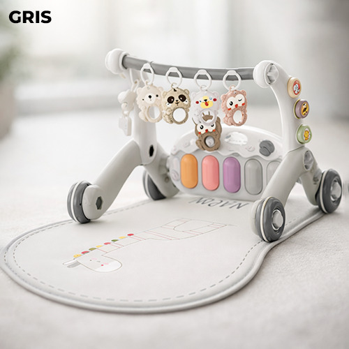 Caminador alfombra 3 en 1 con piano musical. Para dar los primeros pasos, acostarse y usar los muñequitos con sonajero, y sacar todo (como el piano) y jugar mucho. Incluye: Juguetes colgantes con sonajero desmontables, alfombrita, tablero musical multifunción (desmontable), formas geométricas encastrables con animalitos.