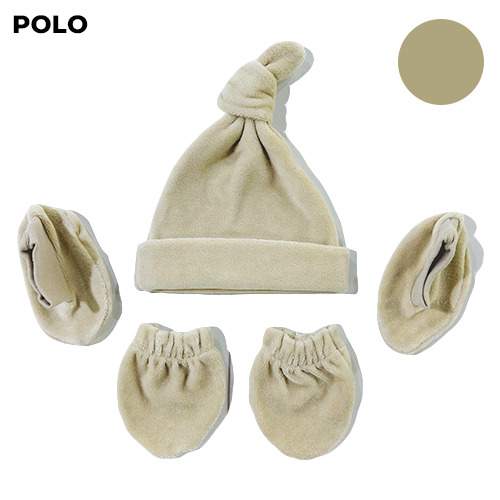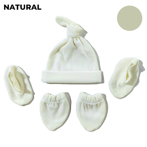 Set de gorrito, mitones y escarpines de plush para bebé.