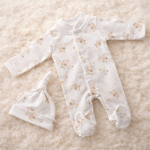 Enterito de algodón estampado abierto por delante con broches y guante opcional y gorrito estampado con nudo.