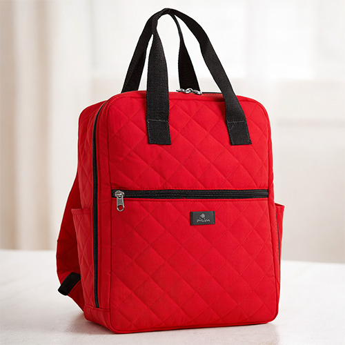 Mochila de gabardina matelaseada. Tapa frontal con apertura total. Interior plástico con 2 bolsillos y espacio porta mamadera. Un bolsillo externo y 2 bolsillos laterales. Tiras regulables. Incluye cambiador.