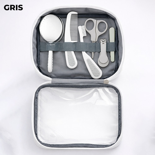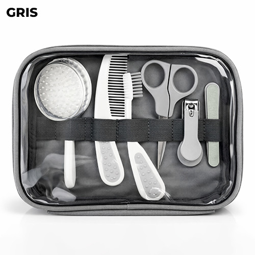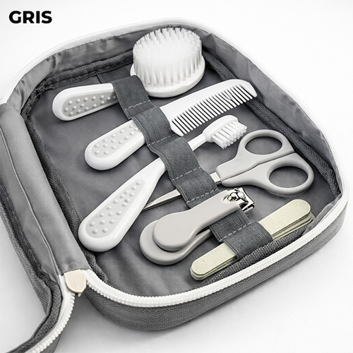 Set de belleza y manicura para bebés + estuche. El set de belleza para bebés incluye 6 productos: 1 peine, 1 cepillo de cerdas sintéticas, 1 tijera para las uñas, 1 alicate, 6 limas de uñas y 1 cepillo de dientes. Presentado en estuche de color con cierre blanco y tapa transparente, para guardar y transportar los productos de forma cómoda y ordenada. El estuche mide 18 x 14 x 4 cm. Productos libres de BPA (Bisfenol A). Trae instrucciones de uso y cuidado en la parte trasera del blister contenedor.