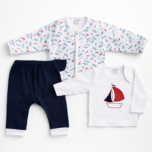 Conjunto en algodón de 3 piezas. Camperita estampada con bolsillo, remera mangas largas con cuello americano y aplique barco y pantalón.